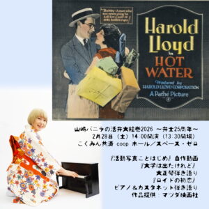 弁士は自分で台本を書きますので、スクリーンの外からおかみさんが声をかける演出にしたのです。「山崎バニラの活弁大絵巻2026 ~弁士25周年~」でも台詞はそのままですので、こういうのも活弁の醍醐味と思ってお楽しみください♪